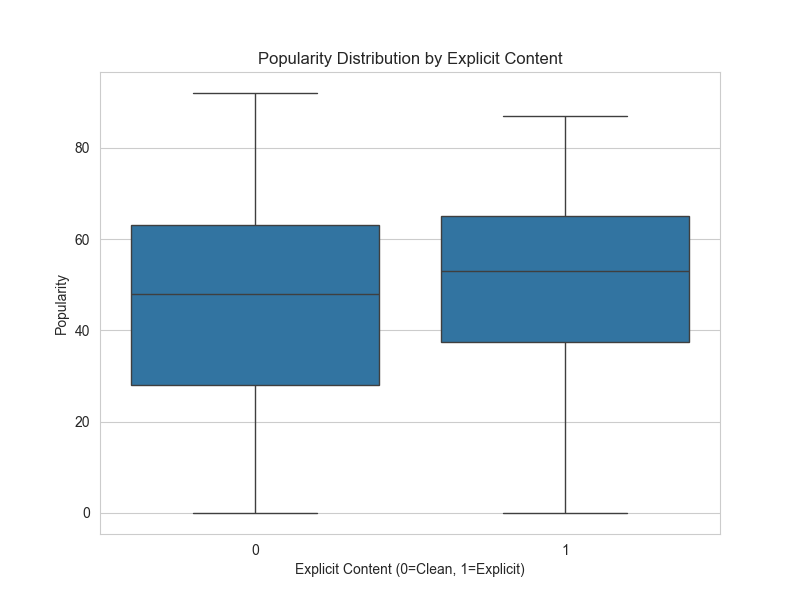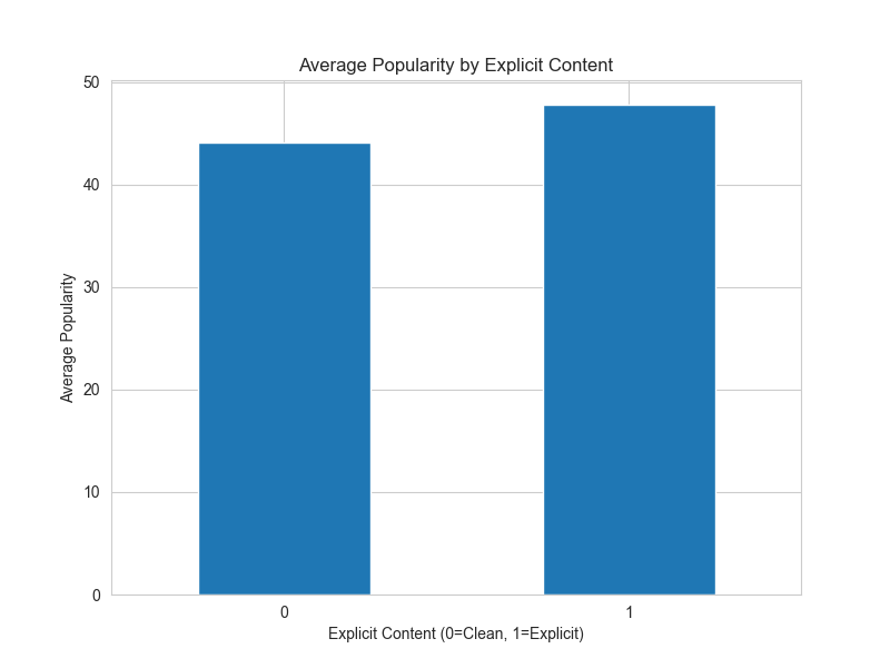 After running my scripts I ended up with 2179 songs, after cleaning the data I found that the average popularity of the music from my 50 most recent playlists was ~44 meaning that they are not being played very frequently and thus not very popular. The song that had the highest popularity was Iris by the Goo Goo Dolls, this had a popularity score of 92 meaning that it is a fairly popular song. I was also interested to see if the popularity of the songs that I listened to were influenced at all by whether or not it was marked as explicit. The graphs can be seen below.